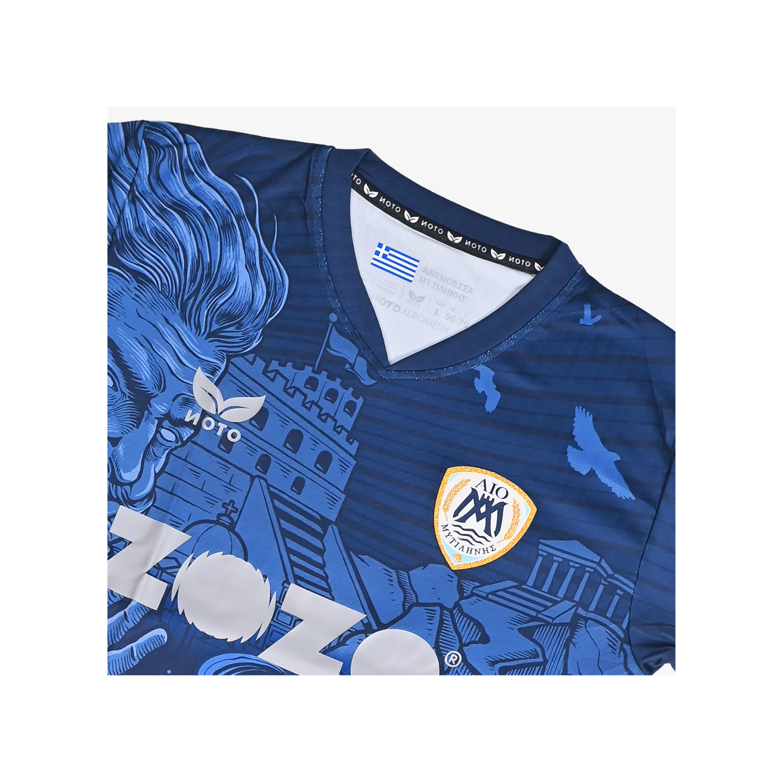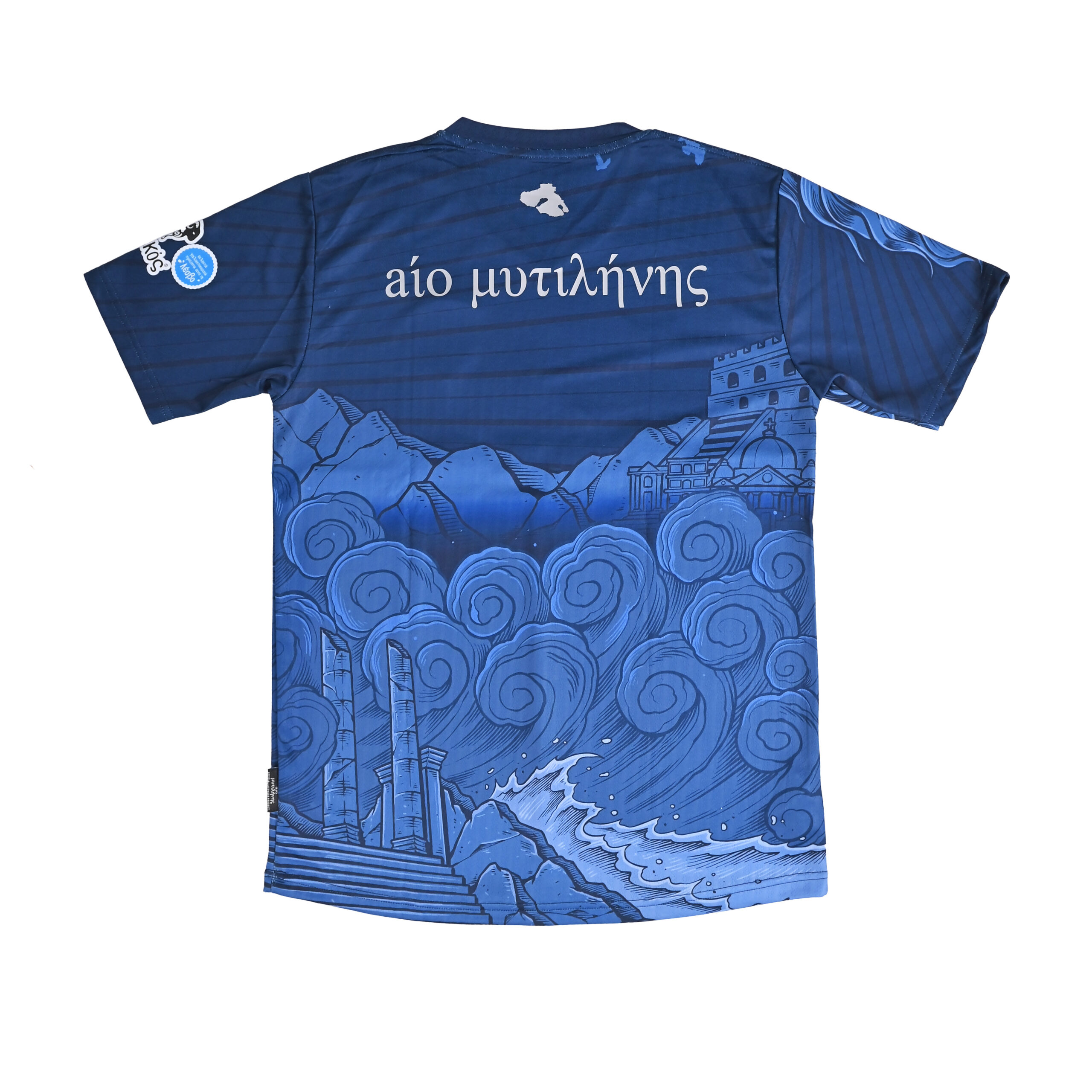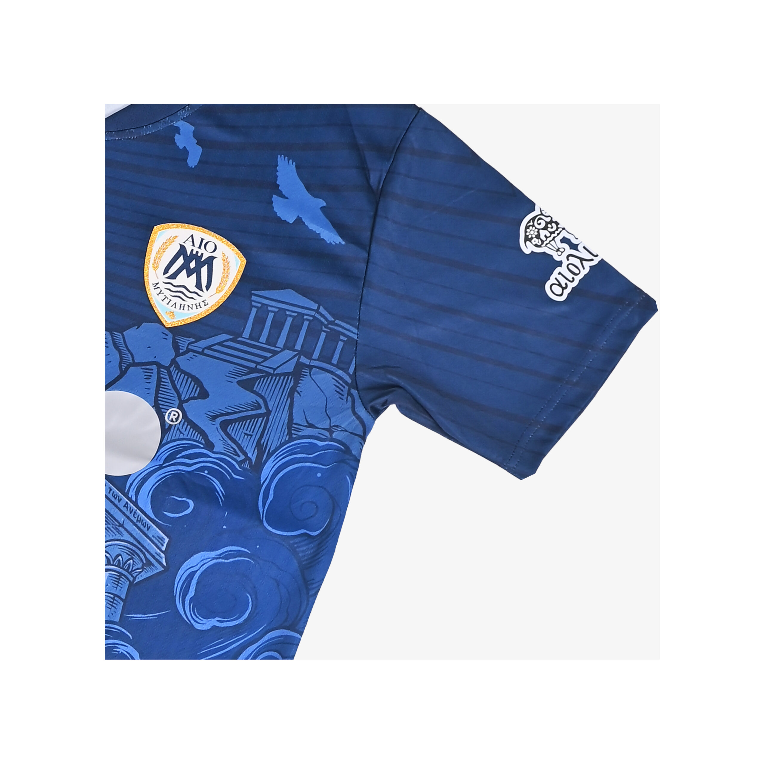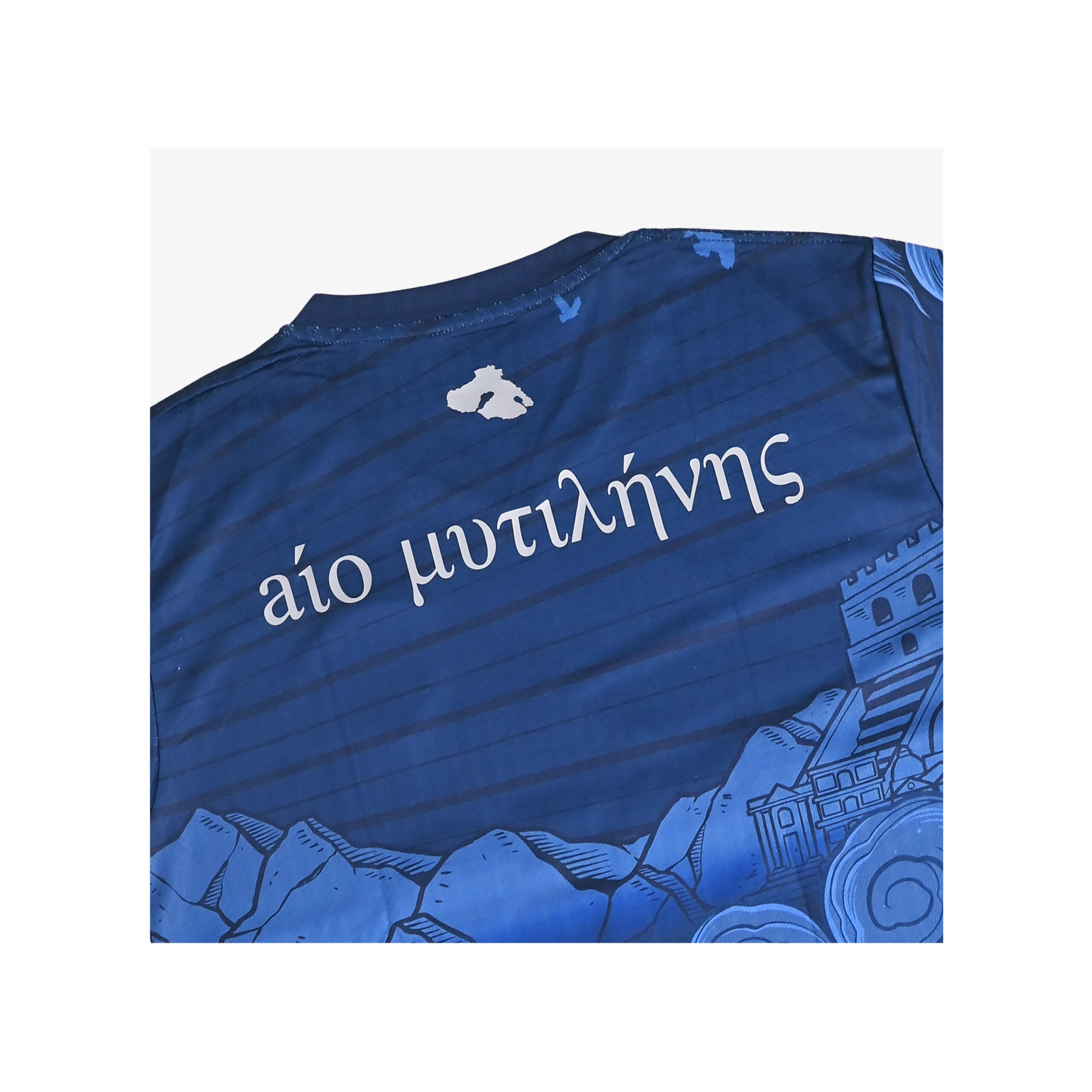The away jersey looks outward, drawing from Aeolus, the God of Wind, symbolizing the constant motion and energy of the Aegean. The deep navy tone represents the island’s sky and sea, while flowing elements create a sense of direction and pace. It is a modern design about movement, change, and taking Lesvos beyond its shores.