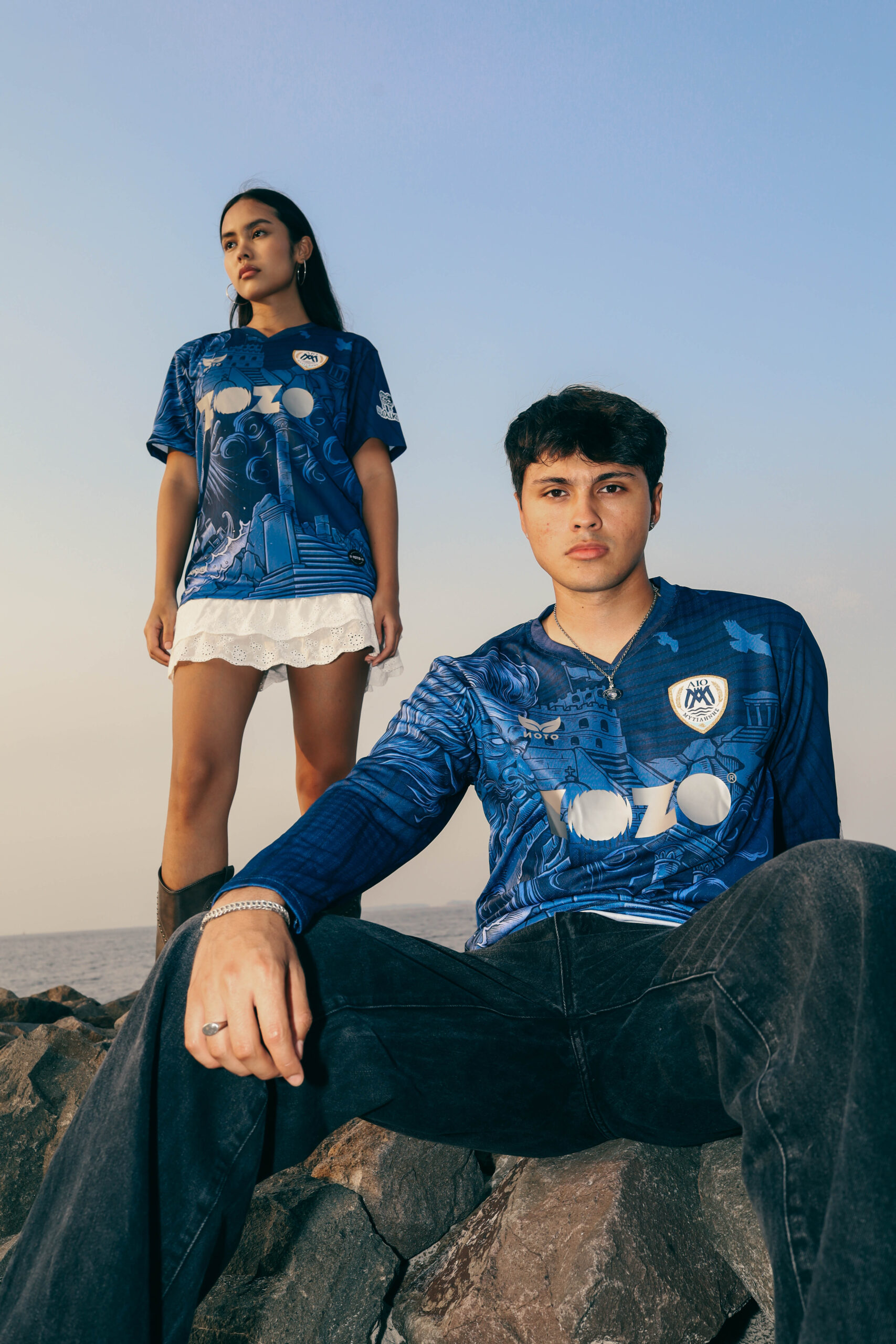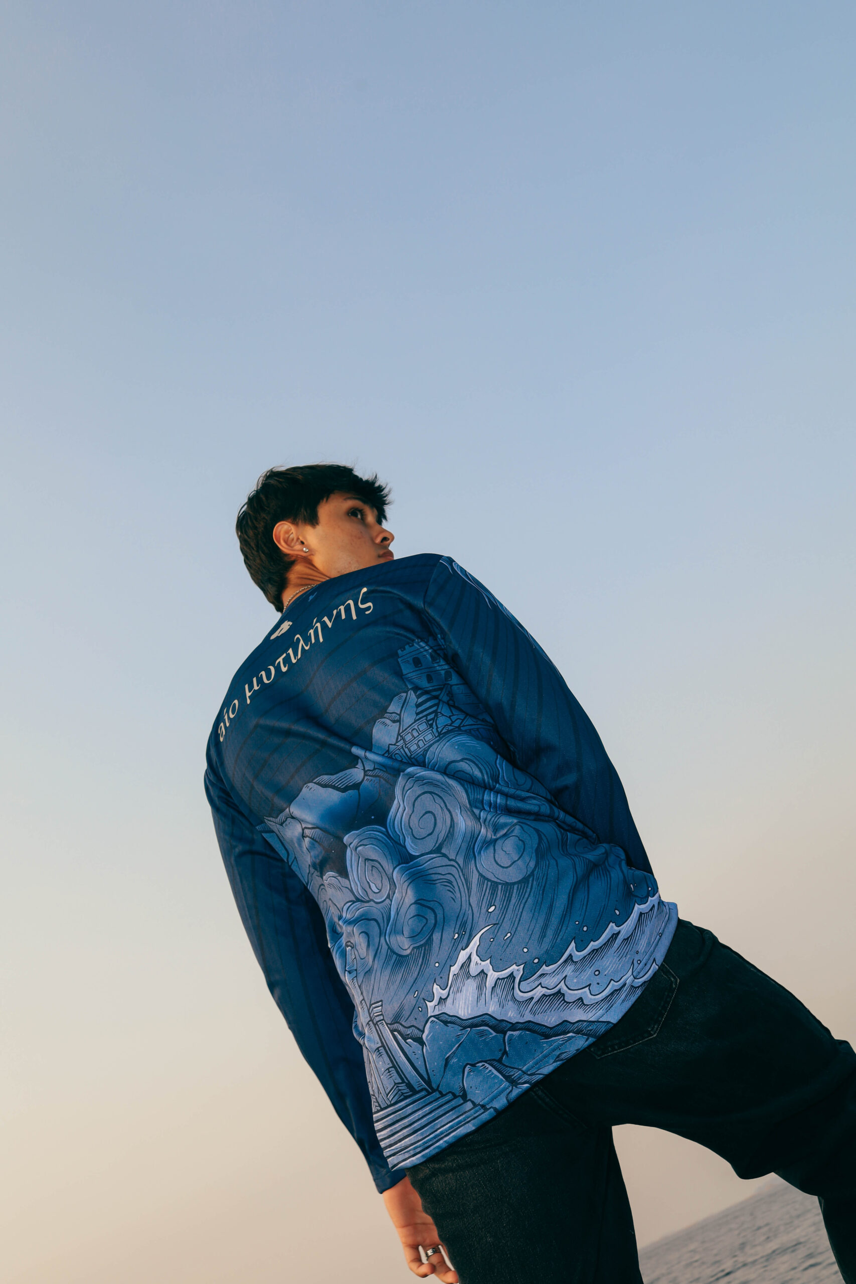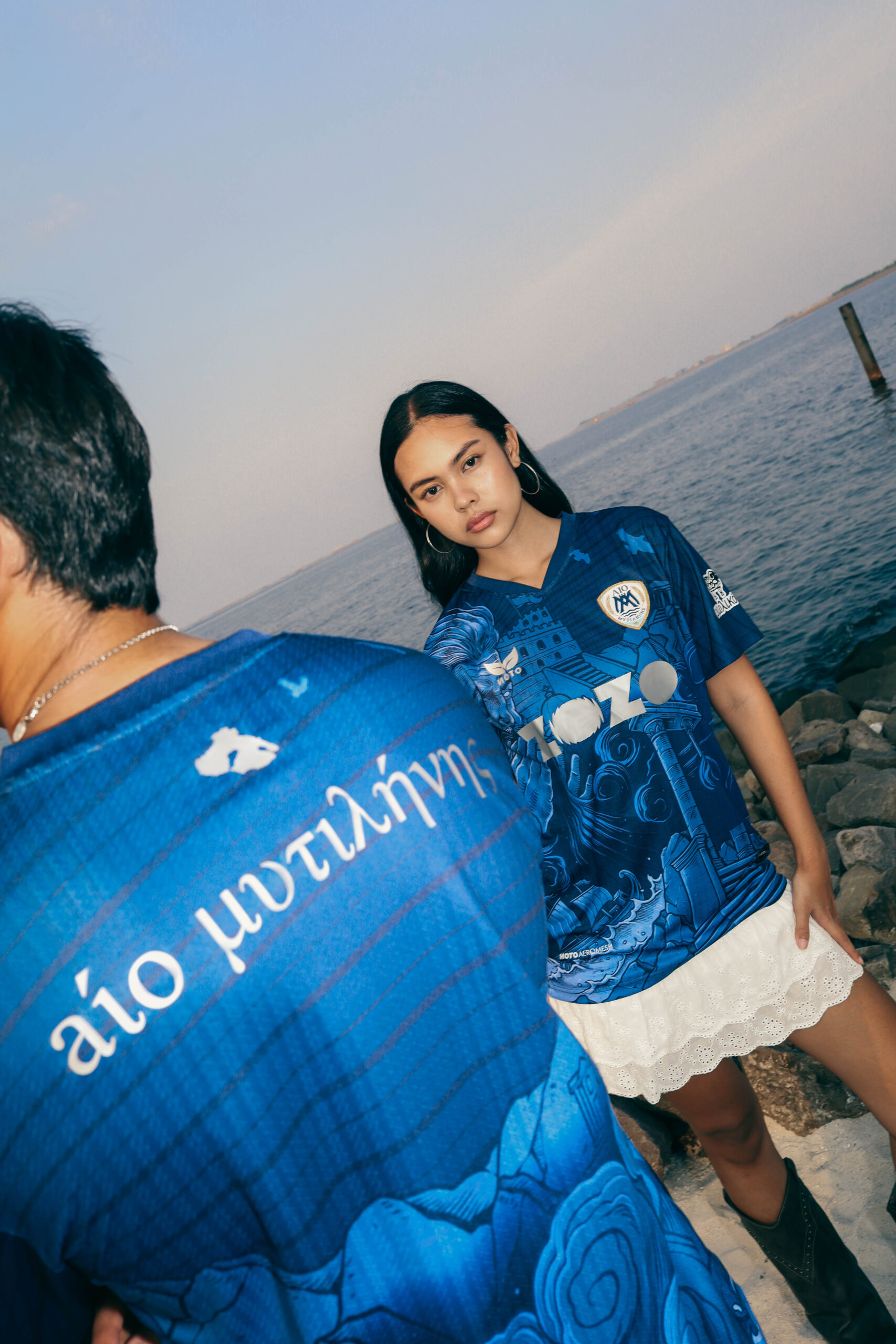 The away jersey looks outward, drawing from Aeolus, the God of Wind, symbolizing the constant motion and energy of the Aegean. The deep navy tone represents the island’s sky and sea, while flowing elements create a sense of direction and pace. It is a modern design about movement, change, and taking Lesvos beyond its shores.