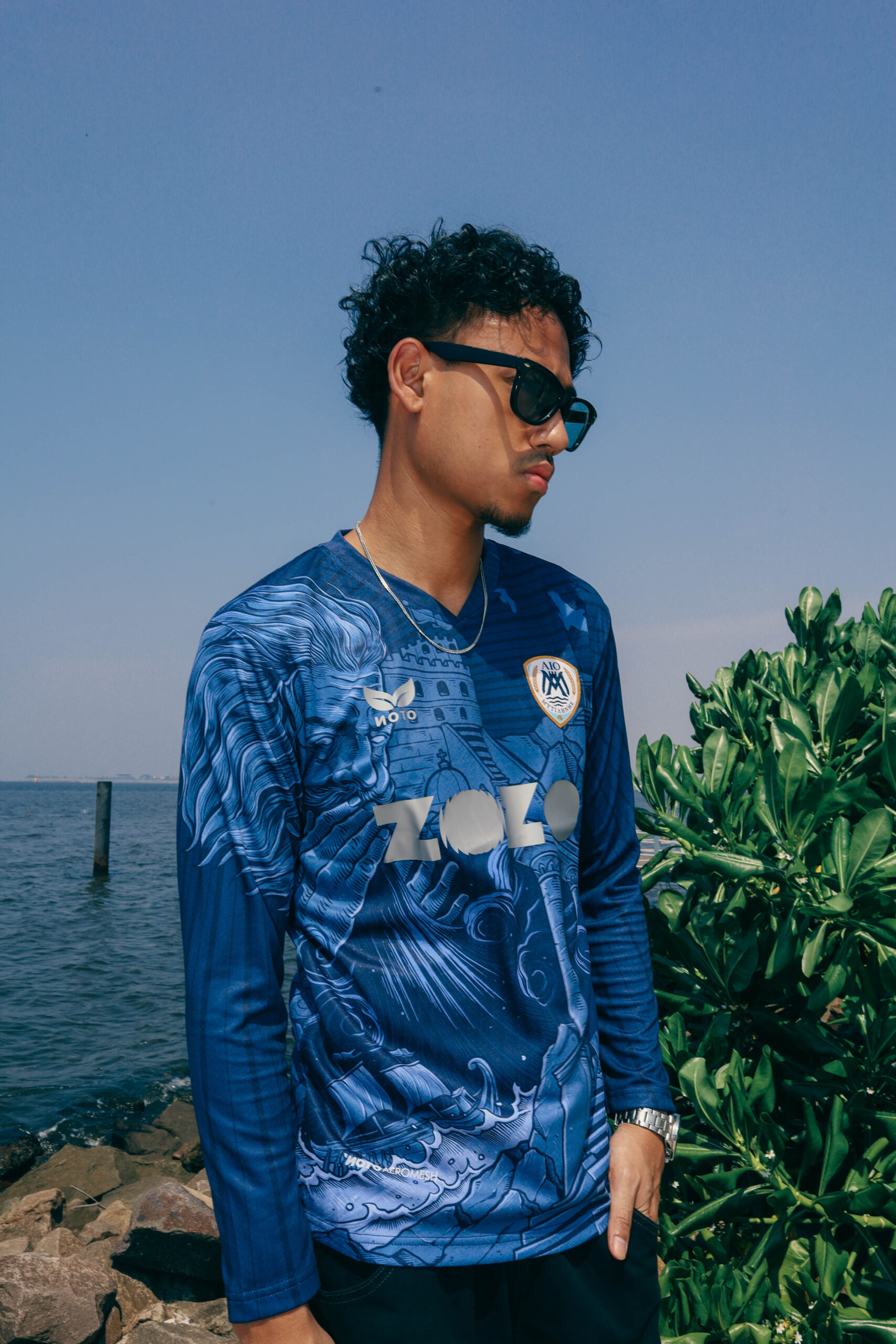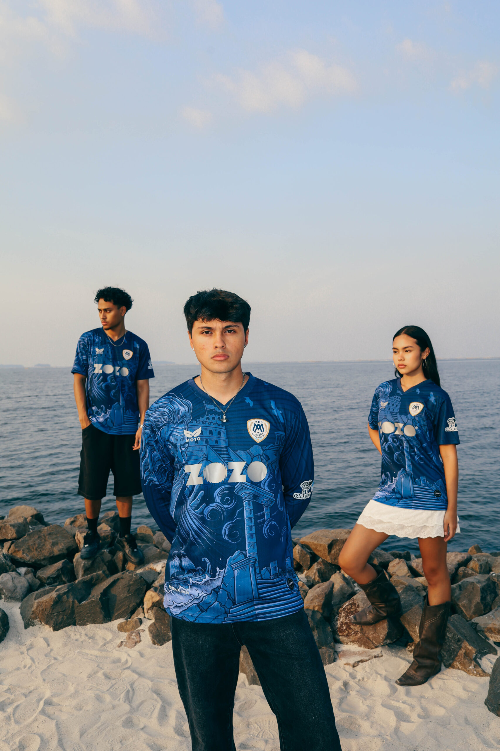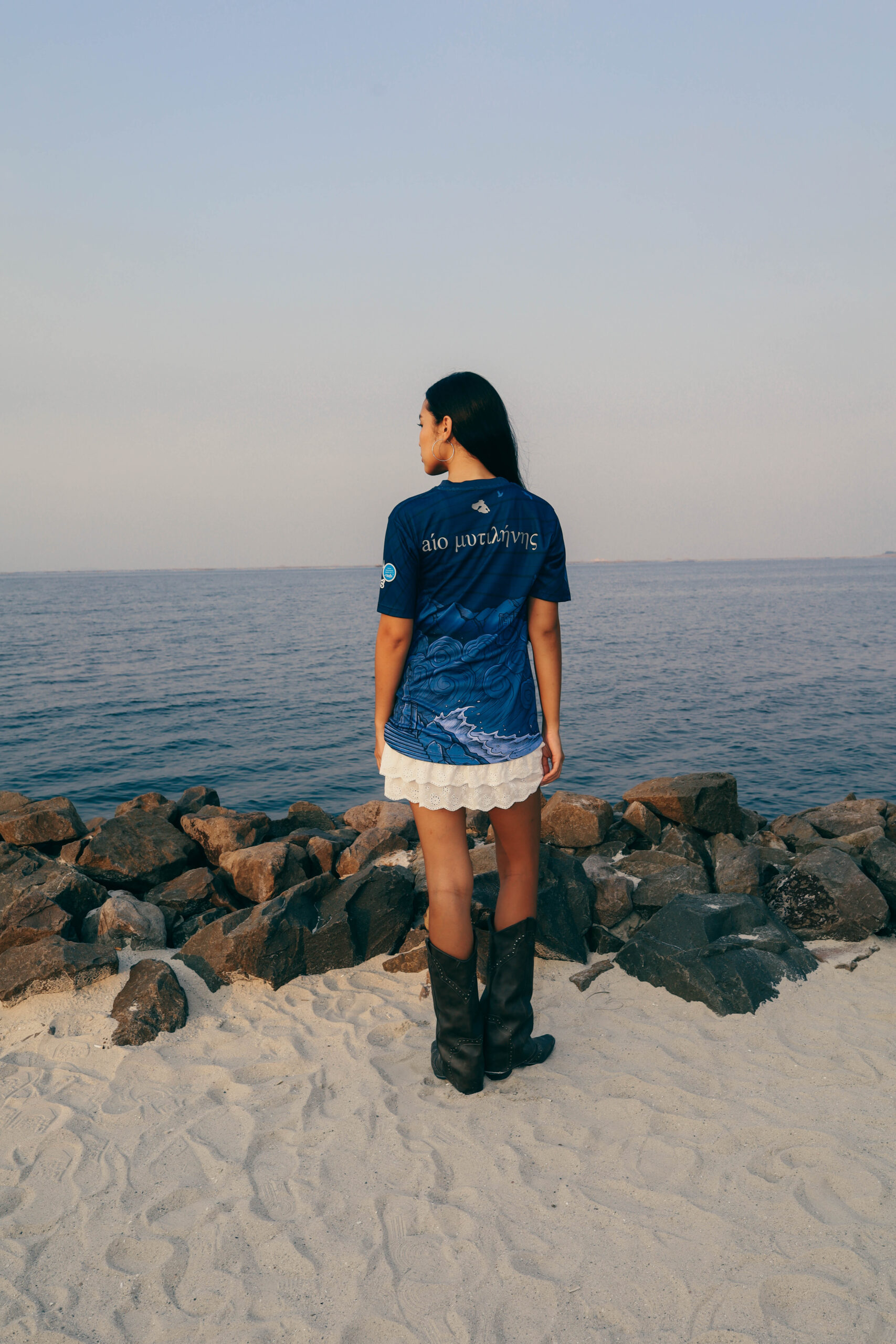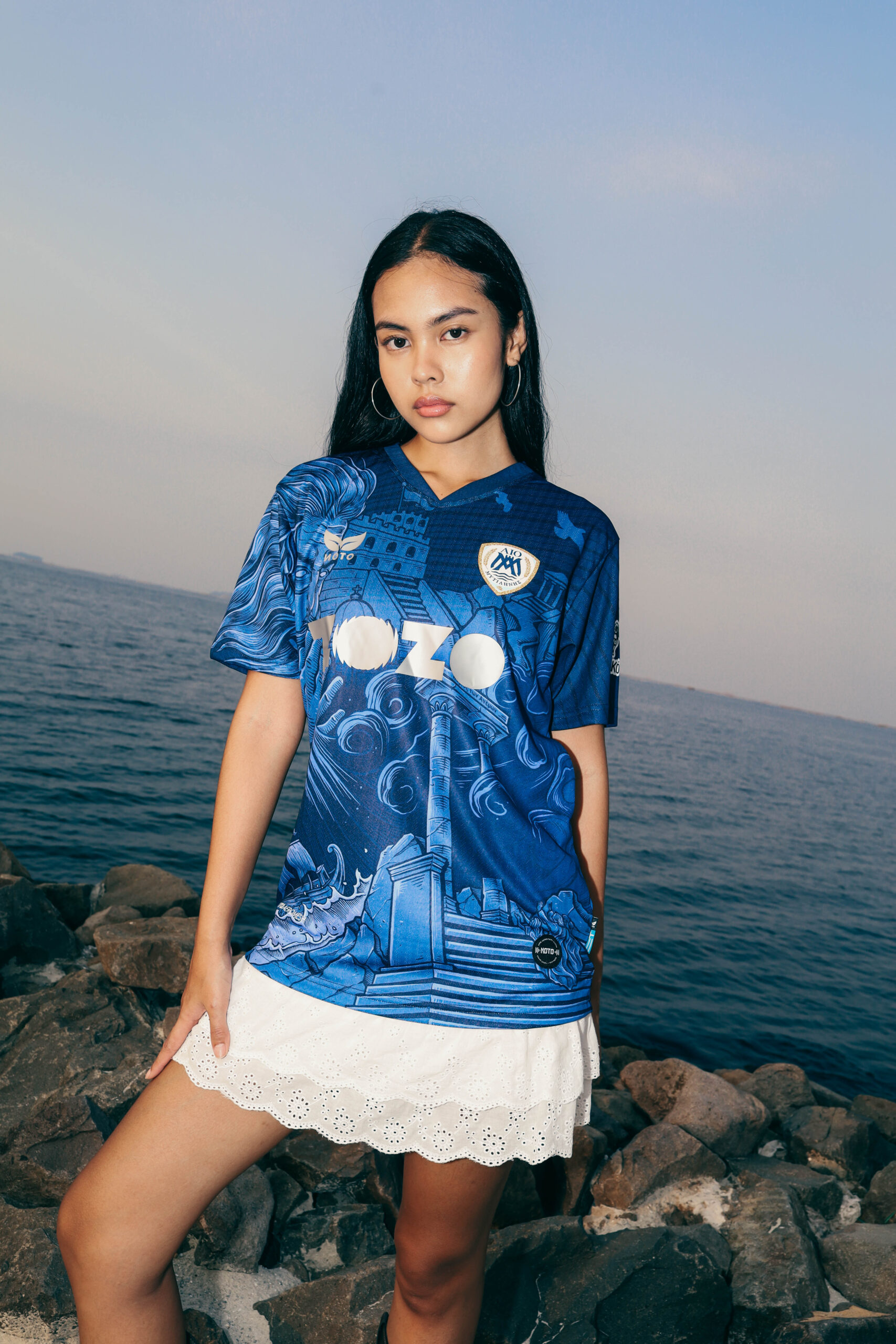 The away jersey looks outward, drawing from Aeolus, the God of Wind, symbolizing the constant motion and energy of the Aegean. The deep navy tone represents the island’s sky and sea, while flowing elements create a sense of direction and pace. It is a modern design about movement, change, and taking Lesvos beyond its shores.